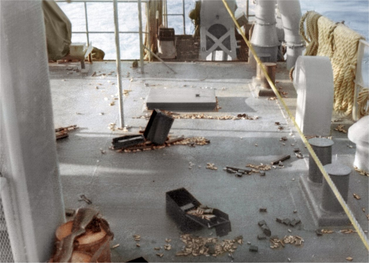 The deck of the gun tub that was hit was blown down into the YFU-4 Craftmaster's quarters. |