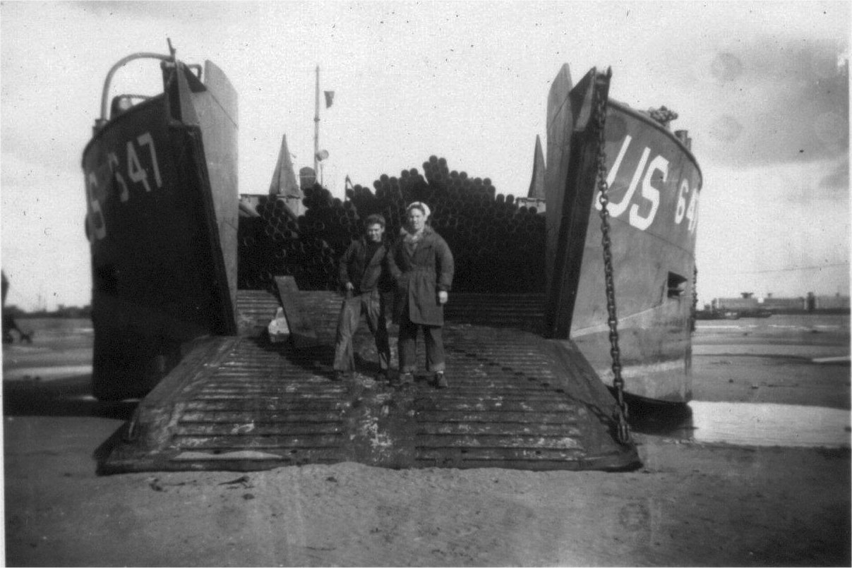 LCT(6)-647 beached with a load of pipes.The names of the two crew members standing on the ramp are unknown, date and location unknown. |