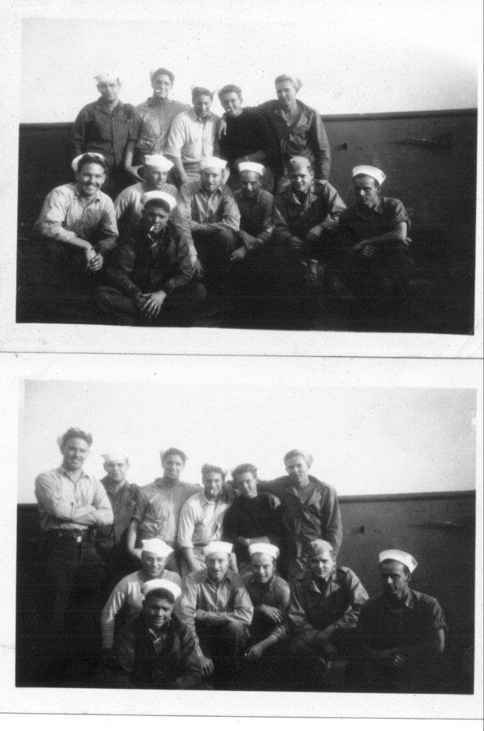 LCT(6)-647 crew photos, in the lower image Kenneth J. Waters MoMM1/c USNR is the man in front, date and location unknown. |