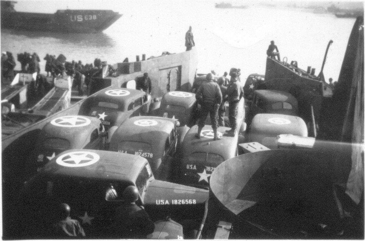 LCT(6)-647 unloading Army staff cars in Normandy, date unknown. Note LCT-638 in background. |