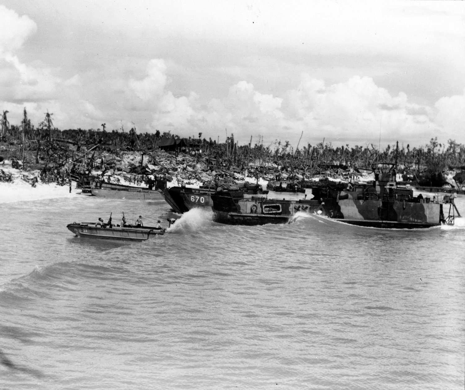 306k | LCT(6)-670 approaching Red Beach during the landing at Angaur in southern Palau Islands in September of 1944. The LCP taking a wave over the stern is
