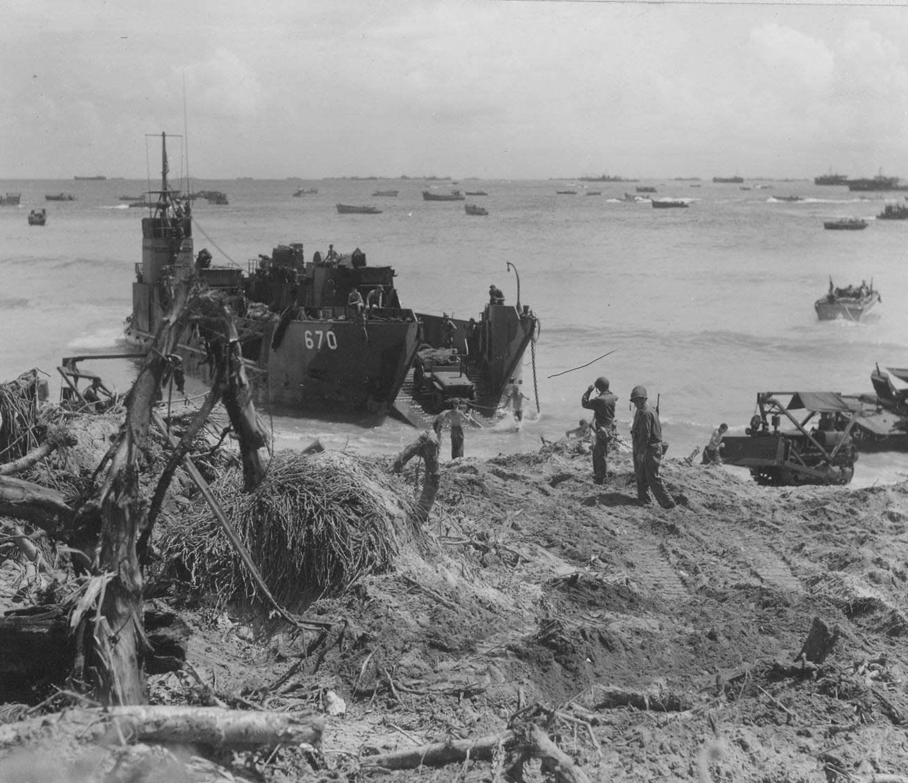 241k | LCT(6)-670 grounded at Red Beach and unloading light vehicles shortly after the above photo was taken. Note the shattered