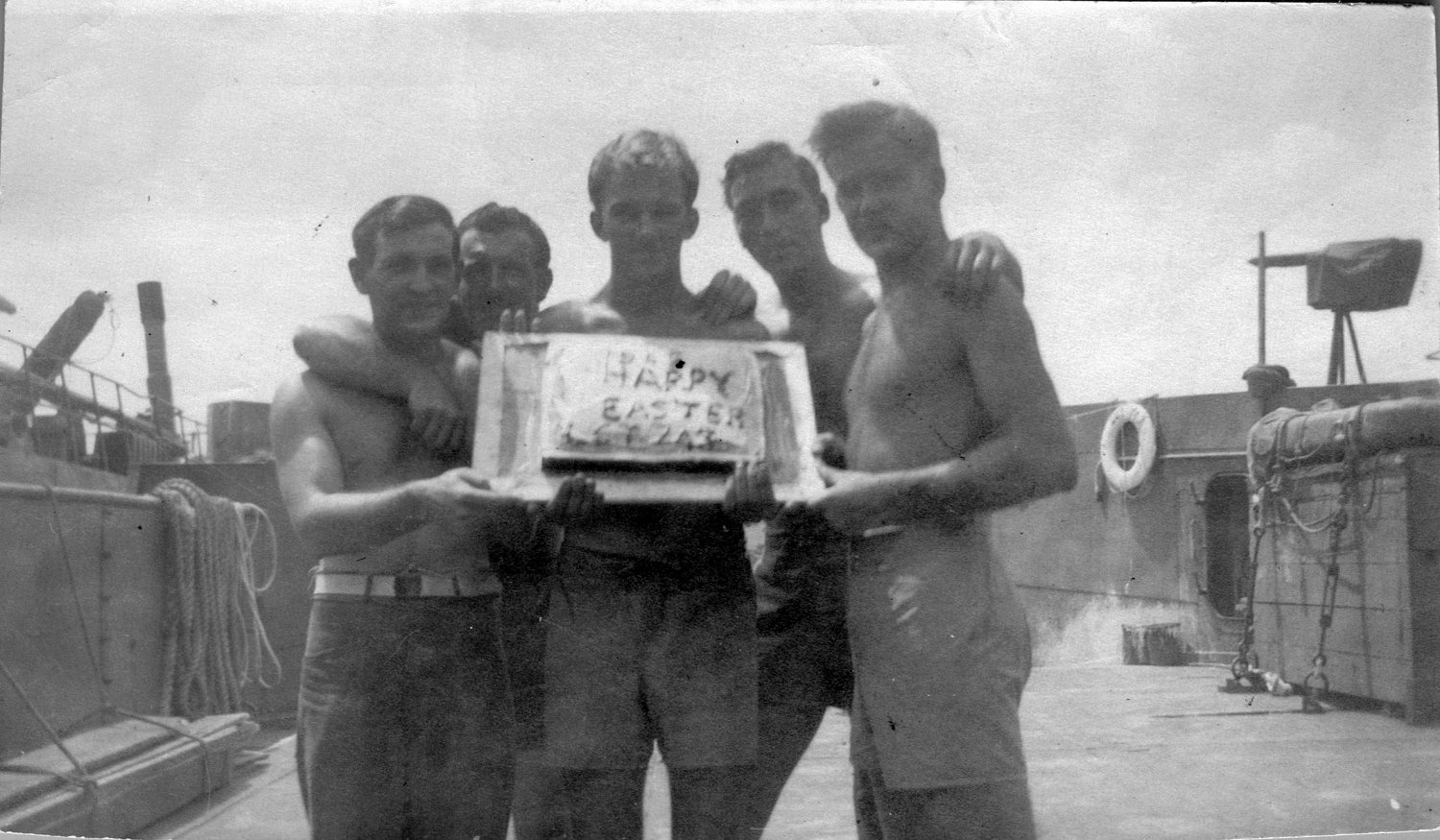 257k | LCT(6)-743 crew members holding a cake the says "Happy Easter LCT 743", probably Easter 1945, location unknown. | Jacob Lipiew | |