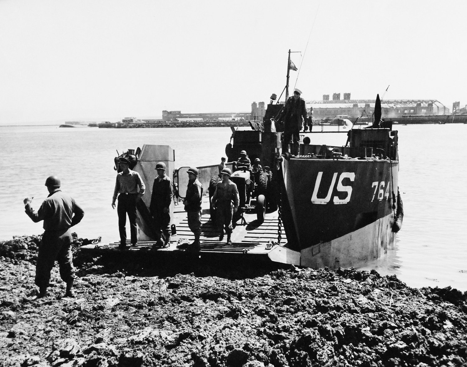405k | LCT(6)-764 unloads tractors, 22 July 1944, to aid in leveling "fill' at one section of Cherbourg Harbor, France.