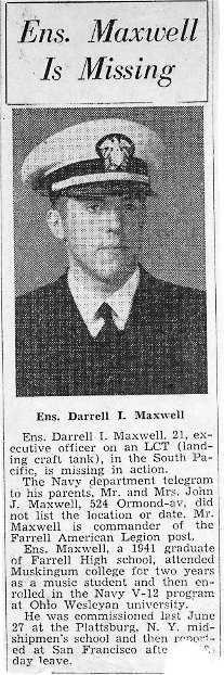 ENS. Darrell Ingram Maxwell, USNR, Executive Officer LCT-1075 (Missing in Action or Buried At Sea, 10 December 1944. Taken from the Tablets of the Missing at Manila American Cemetery, Manila, Philippines.)