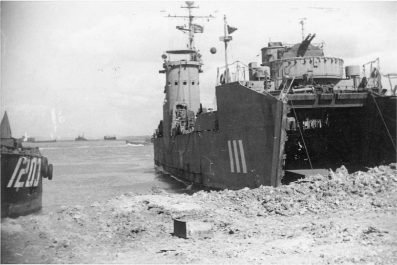 71k | USS LSM-111 and LCT(6)-1203 beached at Okinawa in the fall of 1945. | Submitted by Jon Strupp for Thomas Malke USS LSM-111 |