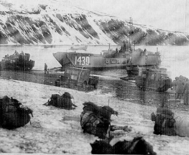87k | LSU-1430 unloading tanks at Kalsin Bay, Kodiak, AK. during Operation Micon 49, 11 February 1949.