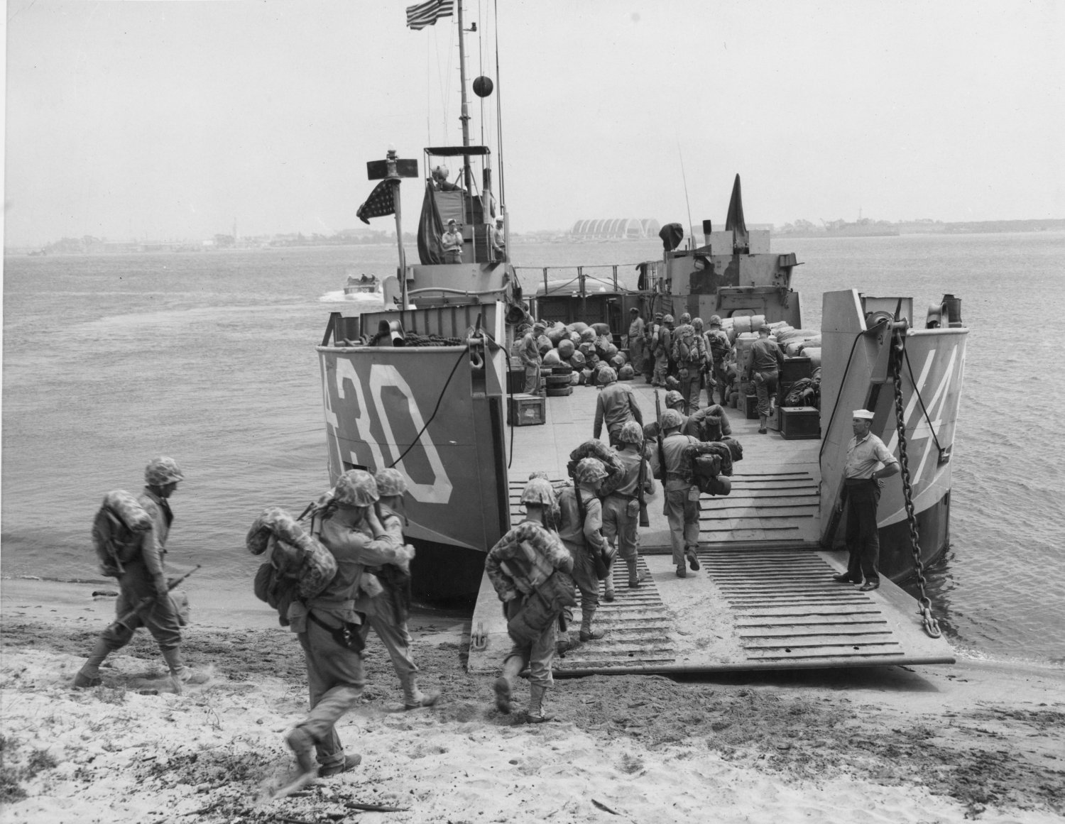 300k | Marines of the 1st Provisional Marine Brigade load aboard LSU-1430 at Camp Pendleton, CA. to transport them to Navy Transports waiting off shore and