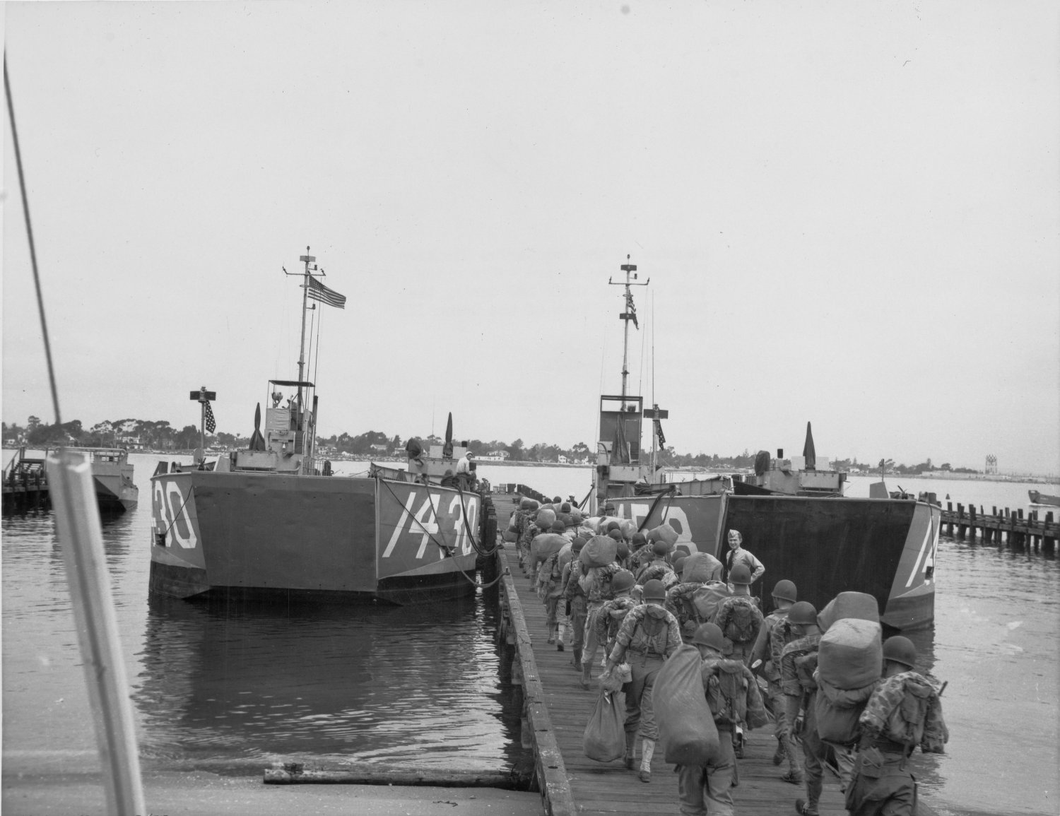 197k | Camp Pendleton, CA. - Marines of the 1st Marine Division FMF embark aboard LSU-1458 (right) and LSU-1430 (left)