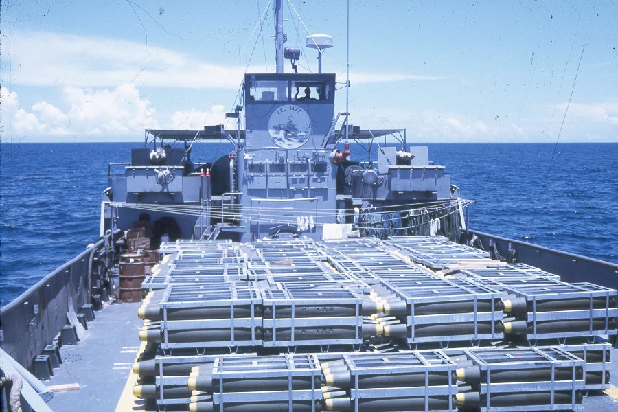 LCU-1477 at anchor off Chu Lai, South Vietnam, with a load of bombs, date unknown. |