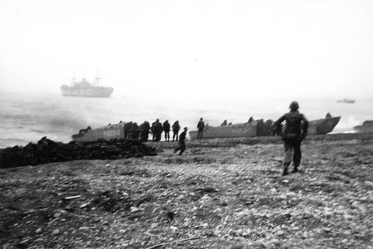 245k | LCU-1481 transporting troops from USS USS Talladega (APA-208) onto a shingle beach, date and location unknown. | Keith Brooker> | |