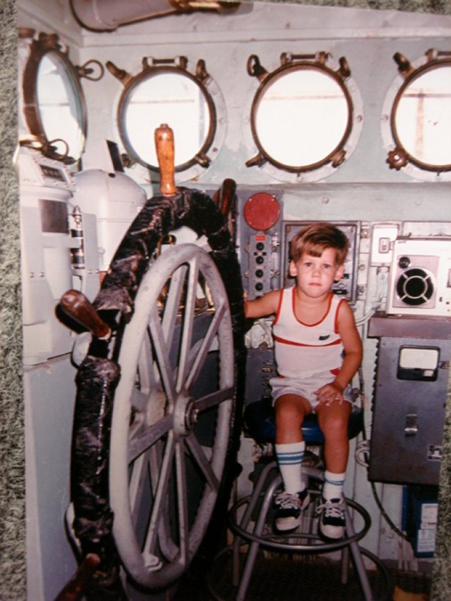 ASDV-2 wheel house with a new recruit at the helm, circa 1986-1990. Note the two helm wheels for rudders and flanking rudders. |
