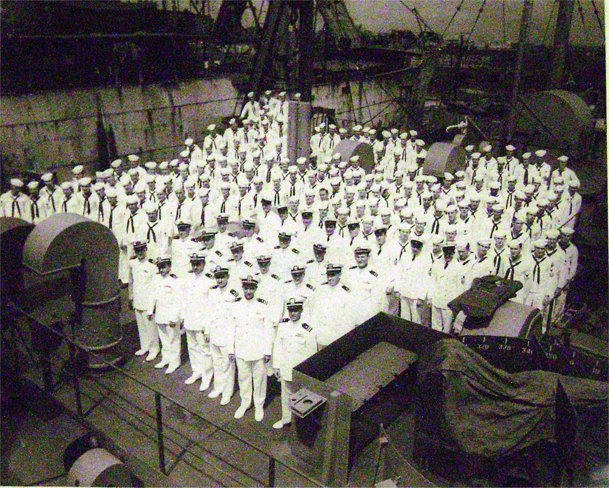 935k | USS Bellerophon (ARL-31) crew commissioning photo, 21 July 1945, at Alabama Dry Dock and Shipbuilding Co., Mobile AL | Rob Wade, courtesy Sid Hisel SM3/c USS Bellerophon | |