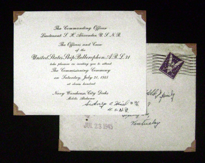 106k | USS Bellerophon (ARL-31) commissioning ceremony invitation, 21 July 1945, at Navy Warehouse, City Docks, Mobile AL | Rob Wade, courtesy Sid Hisel SM3/c USS Bellerophon | |