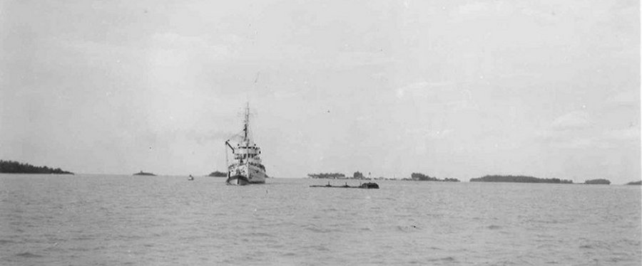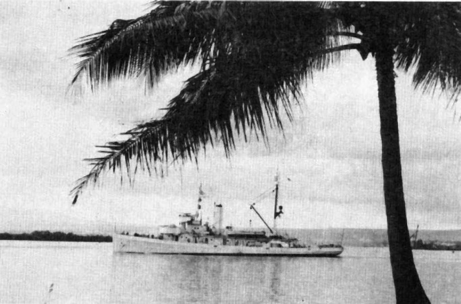 At 10:15 on the evening of 6 May 1942, Lieutenant Commander J. H. Morrill and 17 of Quail’s crewmembers set off on a remarkable journey south towards Australia. They initially traveled at night and hugged the coastline as their 36-foot motor launch plodded along at three knots. The men camouflaged the tiny vessel with green fronds and branches and painted it black so that it would look like a harmless native fishing boat. They avoided numerous Japanese aircraft, destroyers, minesweepers, and patrol boats as they continued southwards along the Philippine coastline. They stopped a few times along the coast of Luzon, where some kind Filipino villagers gave them food and water. By 13 May, they headed into the more open waters of the Sibuyan Sea and moved past the southwest end of Masbate Island in the central Philippines. They passed a Japanese tanker along the way, but the tanker ignored them, possibly thinking that they were either pirates or fishermen. They reached Cebu on May 15. On that same day they landed on the northwest coast of Leyte and bought some diesel oil and canned goods from a Chinese storekeeper. Morrill and his men also learned that the Japanese were on Leyte and that they were looking for Americans. Morrill and his crew left and continued south, headed for Surigao Strait between Leyte and Dinagat Islands.