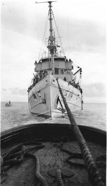 Lieutenant Commander Morrill went ashore at Fort Hughes and found some men to help him scuttle Quail. But when they were ready to board the ship’s boat to return to the minesweeper, a shell sank their small boat. Morrill and four men swam 200 yards to another small boat moored near the dock and, while under enemy fire from circling Japanese warplanes, somehow managed to return to Quail. Morrill and his men made it back to the minesweeper and they scuttled the ship.