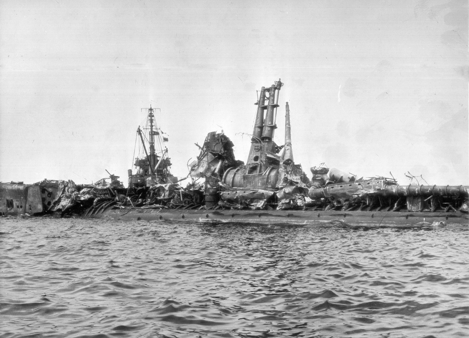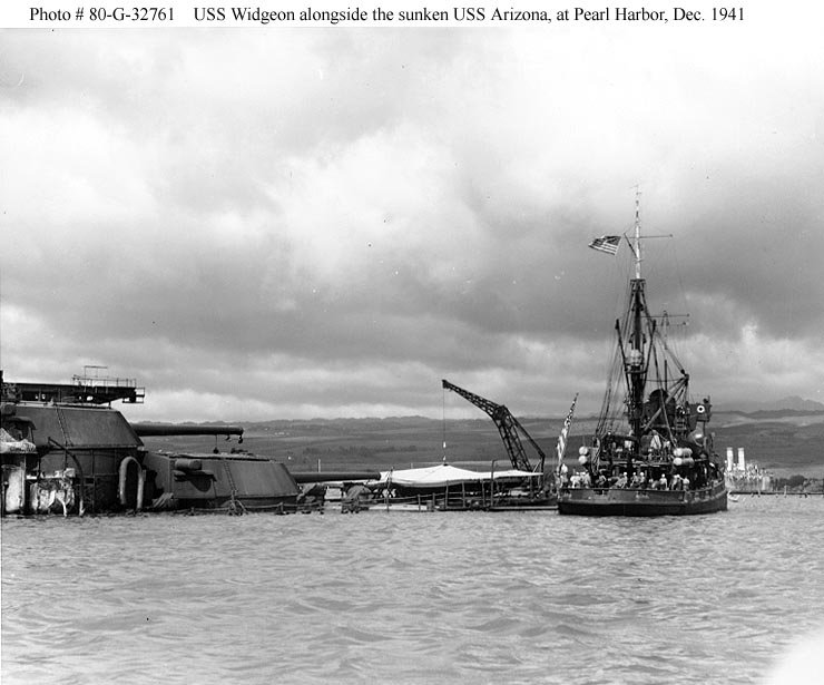 73k | Widgeon alongside the stern of sunken Arizona (BB-39), probably on or about 8 December 1941. Arizona's two after triple 14"/45 gun turrets, visible at left, were later removed and turned over to the Army for use as coastal defense batteries on Oahu. In the right distance is the hulk of the old minelayer Baltimore (CM-1) National Archives photo 80-G-32761 |