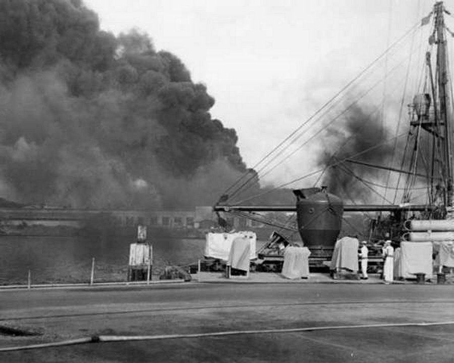 79k | 7 December 1941 Widgeon during the Pearl Harbor attack with a McCann Submarine Rescue Chamber [invented by LCDR Allan McCann] is seen on deck |