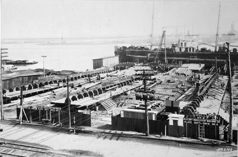 9 January 1918 Alabama Dry Dock and Shipbuilding Co., Steel Hull and Plate Dept., Mobile, AL Construction of minesweepers Nos. 34, 35 and 36 for the U.S. Navy. Photo shows keels laid in construction yard, work started for the preparation of the yard, 1 October 1917; conditions as indicated on picture National Archives photo ID 45548963