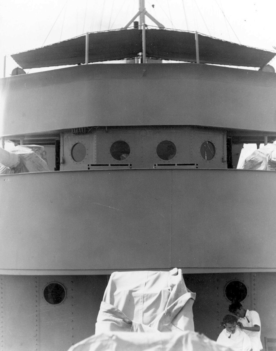 Looking aft from fo'c'sle, showing armor on bridge decks, at Cavite, Philippine Islands, in mid-1941 National Archives photo 19-N-27105 |