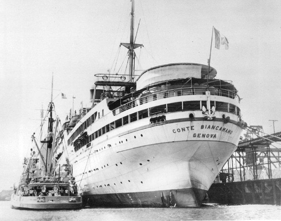 5 April 1941 Cristobal, Panama Canal Zone Photo caption: "The 23,225-ton Italian liner Comte Biancamano [later Hermitage (AP 54)], as she was taken over by U.S. Naval units here March 30, by order of the U.S. Government. Alongside is the USS Mallard from which a boarding party went on the liner, one of the twenty-eight Italian ships seized in U.S. Territorial waters. Five hundred members of the crew are to be transferred to New York, it was learned yesterday." Wide World photo |