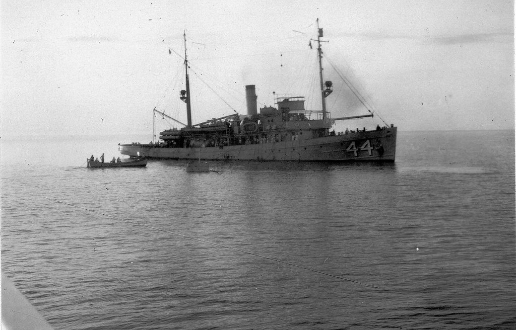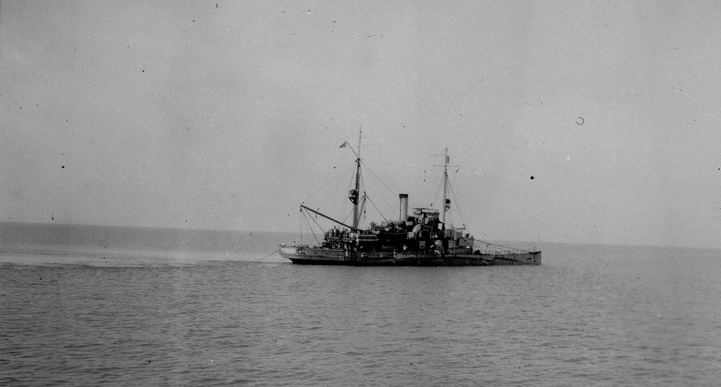 SC-37 shown after damaged by a mine explosion on 5 July 1919 while helping clear the North Sea mine barrage. SC-206 and an unidentified minesweeper [possibly Mallard, Minesweeper No. 44] are standing by. She was quickly repaired and was again damaged on 4 August 1919 Naval History and Heritage Command photo NH 42580 |