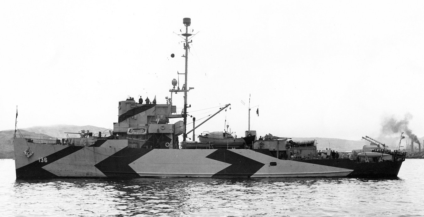 488k | Original photo: c. 1944 Showing the ship's "main battery" of a 3" dual purpose gun forward, with a "Hedgehog" mount immediately aft Second replacement photo: c. 1943 Off the U.S. east coast National Archives photo 80-G-411693 |