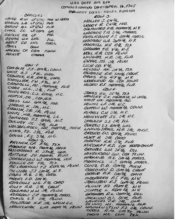 84k | 16 April 1945 Mallory Line Docks, Tampa, FL Commissioning Day Front row: 3rd from left LTJG Alexander Z. "Jerry" Brown, USNR; 4th from left: LT John C. Engle, USNR, Commanding Officer Photo from National Museum of the U.S. Navy |