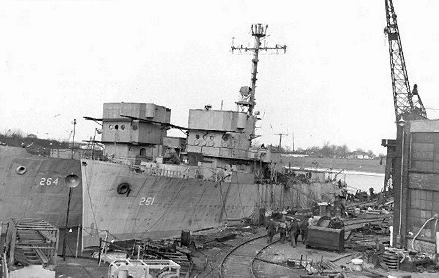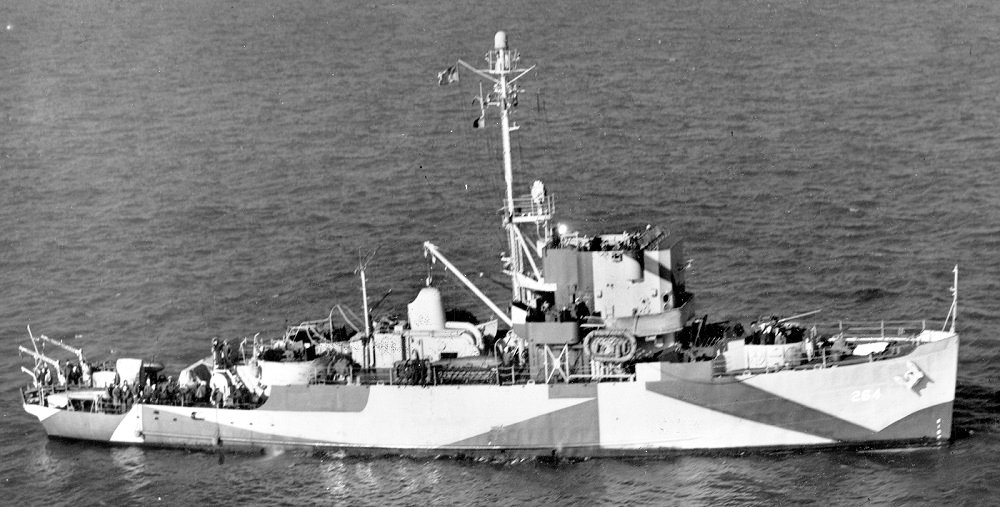 Method (AM-264) view from the starboard side wearing camouflage Design 21D taken by NAS Norfolk on 11 January 1945. The measure here should be Measure 32, but the darkest color appears to be navy blue instead of black, so this may be Measure 32a National Archives photo 80-G-307276, courtesy of C. Lee Johnson, Ships of the U.S. Navy in WWII “Dazzle” Camouflage |