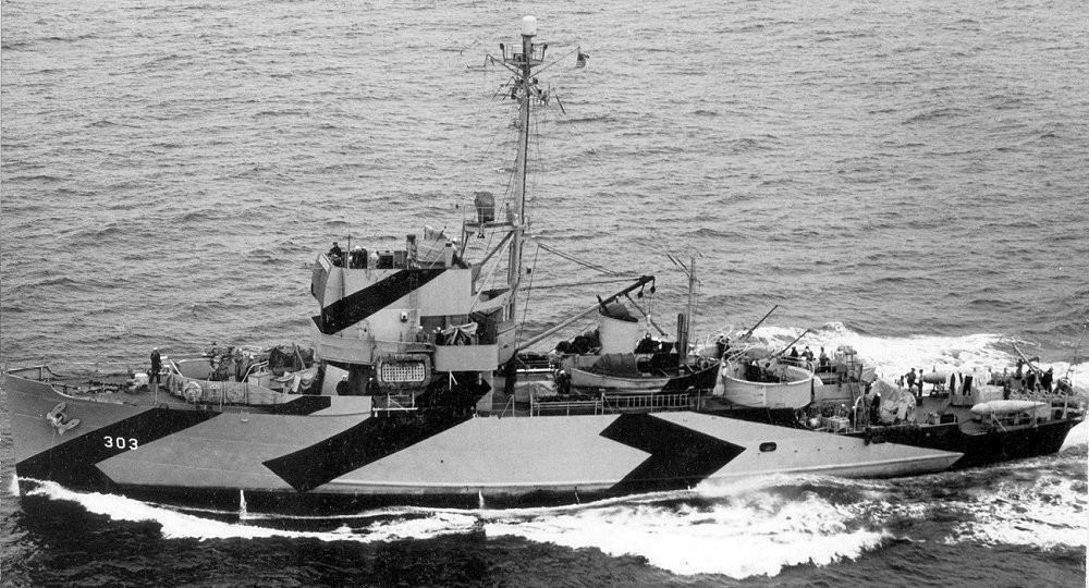 191k | Starboard side aerial view of Skirmish (AM 303) underway off San Pedro, California on 2 September 1944 wearing Measure 32/21d camouflage scheme National Archives photo 80-G-242519, courtesy of C. Lee Johnson, Ships of the U.S. Navy in WWII “Dazzle” Camouflage |