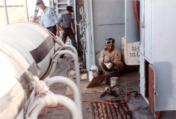 65k | c. fall 1989. Basrac Shipyard worker repairs deck on port side O1 level |