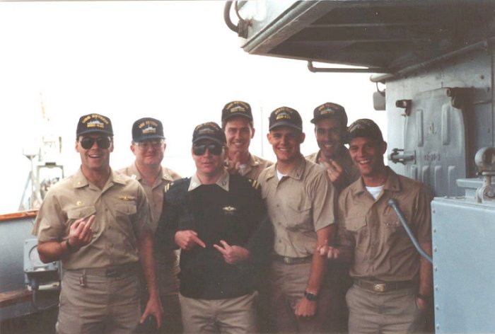 48k | c. Winter 1989. Esteem's Wardroom. LCDR Steve Johnson (CO), LT Russ Harris (XO), LT Dave Bruin (Chief Engineer), ENS Wes Spence (Deck), ENS Tom Womble (Supply), LTJG Pete Petrucione (Operations), ENS Steve Powell (Communications), on port side of Pilot House while ship was inport Basrac Shipyard, Bahrain |