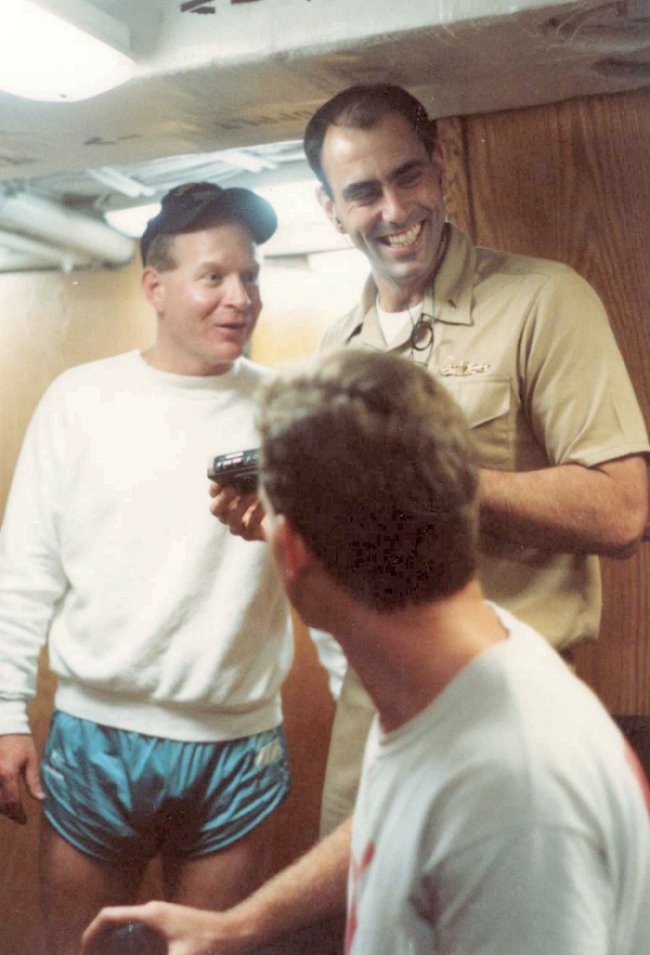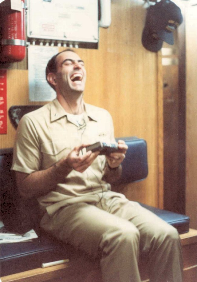 91k | c. Winter 1989. LTJG Pete Petrucione enjoys a humorous tape on an off duty night in the Arabian Gulf. |
