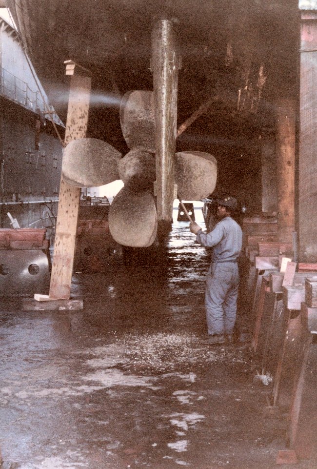 182k | c. Winter 1989. Port propeller, in dry dock, Basrac Shipyard, Bahrain. |