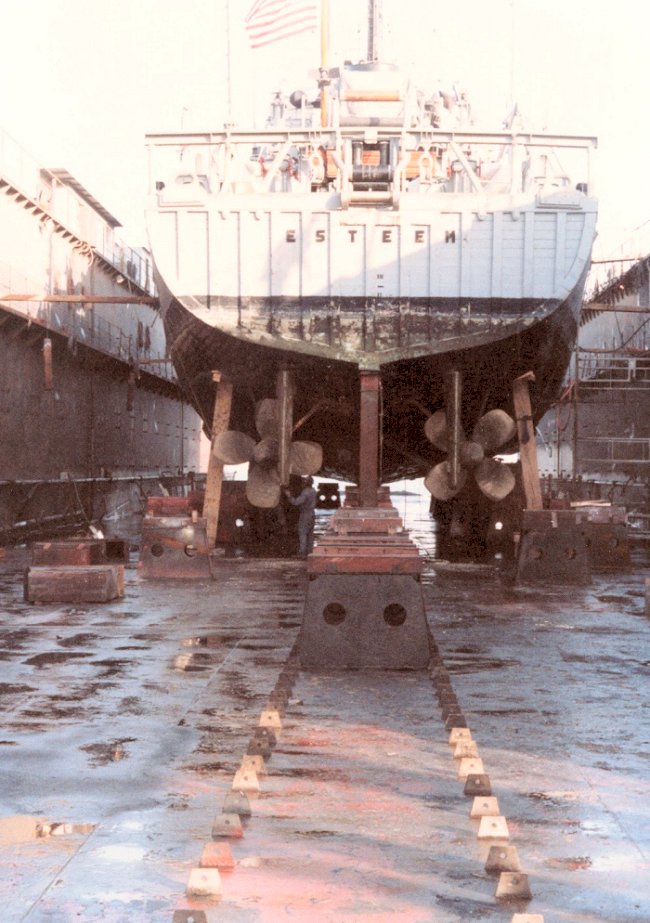 102k | c. Winter 1989. Stern view, in dry dock, Basrac Shipyard, Bahrain. |