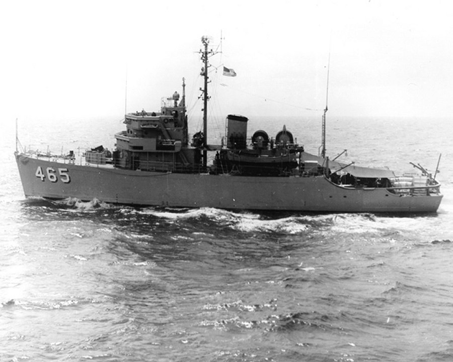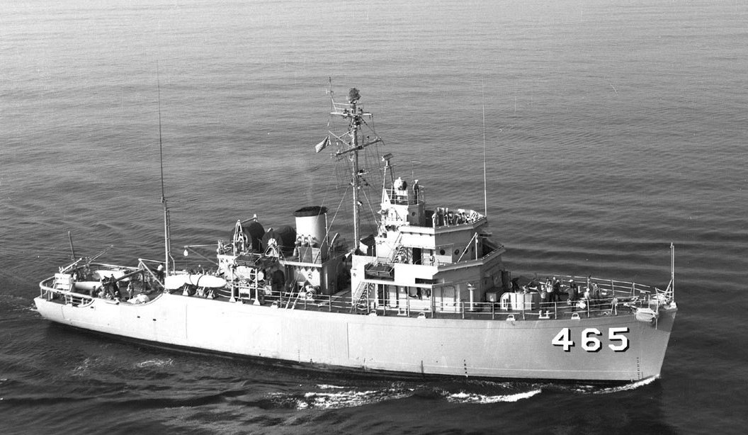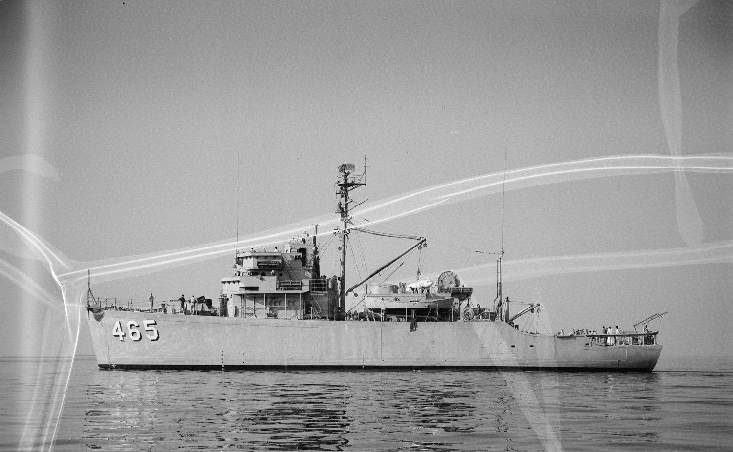 123k | Taken in Long Beach in late 1957. Note that she is in her original MSO configuration with a short stack and a boom for handling the motor whaleboatPhoto courtesy of Jerry Tallent | Save An MSO Web Site Dick Lewis |