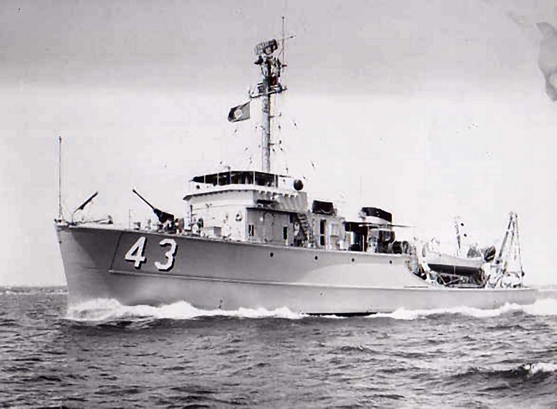 55k | Bittern showing her single 40mm Bofors gun forward, boats and minesweeping gear aft Naval History and Heritage Command photo |