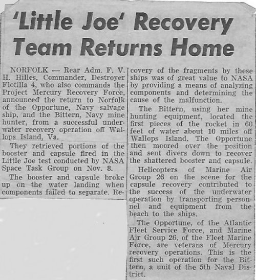 80k | c. December 1960 Newspaper clipping concerning Project Mercury Little Joe V recovery |