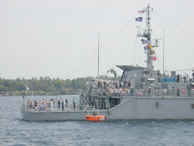2 July 2000 Clayton, NY Kingfisher lowers a remotely-operated mine neutralization vehicle as a demonstration for civilian guests during a day sail on the St. Lawrence River. Kingfisher, a coastal minehunter, and USS Defender (MCM 2), a mine counter-measures ship, are visiting Clayton, N.Y., as part of the Navy's Great Lakes Cruise 2000. The Navy sponsors the annual cruise to raise awareness of the Navy for the people of the Great Lakes Region and to promote recruiting. U.S. Navy photo by Lt. Catherine Perreault. [000702-N-5962P-004]. |