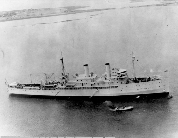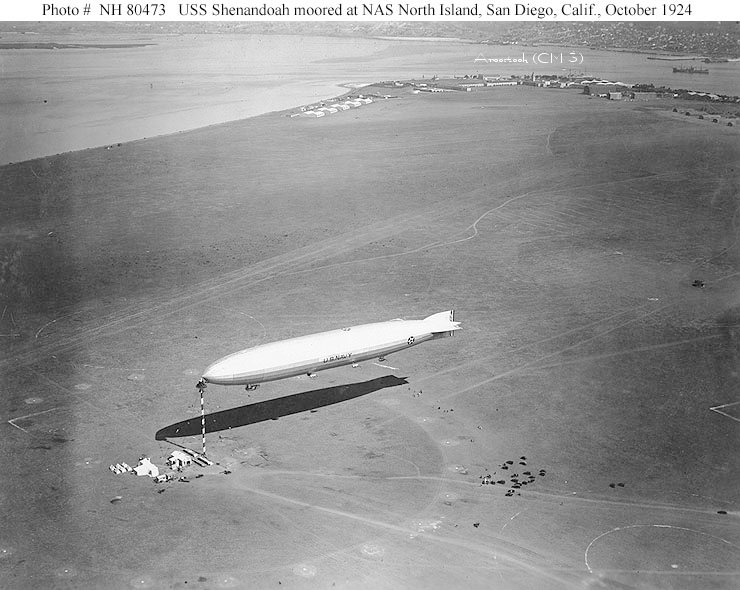 USS Shenandoah (ZR-1) moored at Naval Air Station North Island, San Diego, California, in October 1924. Aroostook is tied up to the Air Station pier in the upper right, with a storeship (Arctic, Boreas or Yukon) moored in the channel nearby. | Donation of Lieutenant Gustave J. Freret, USN (Retired), 1972 U.S. Navy photo NH 80473 ![]() 79k |