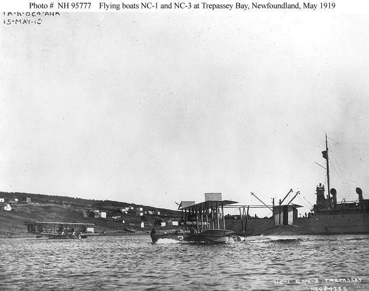 Seaplane NC-3 taxies past Aroostook in Trepassey Bay, Newfoundland, 15 May 1919. NC-1 is moored at left. Aroostook served as the planes' tender during their May 1919 trans-Atlantic flight attempt | U.S. Navy photo NH 95777 Naval Historical Center |