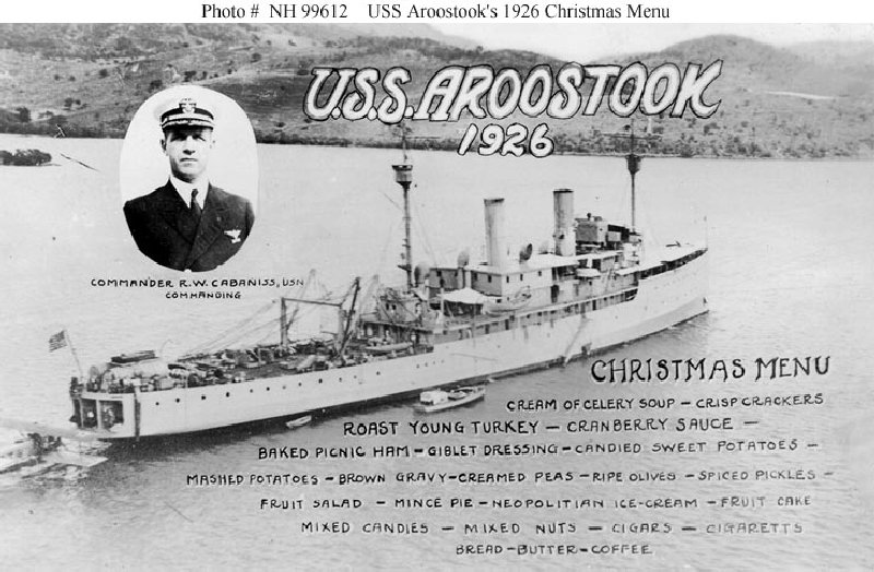 Ship's Christmas menu for 1926, featuring photographs of the ship and of her Commanding Officer, Commander R.W. Cabaniss, USN | Collection of Lieutenant Oscar W. Levy, USN (Supply Corps), Retired. U.S. Navy photo NH 99612 ![]() 107k |