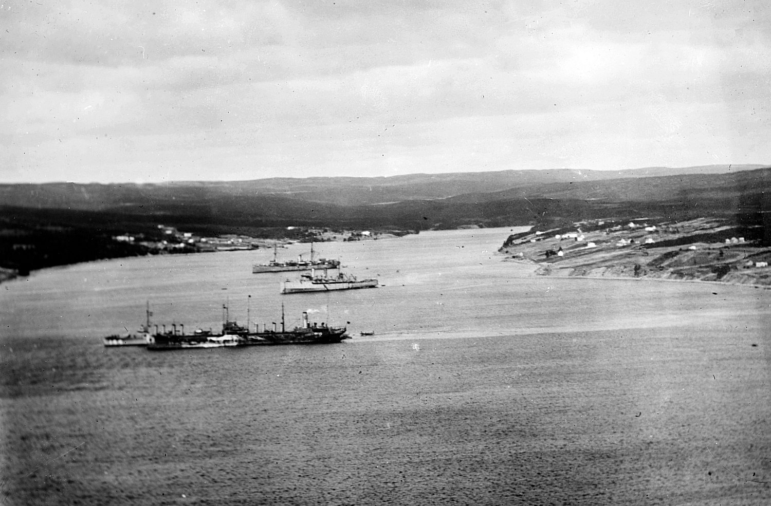 277k | Trepassey Bay, Newfoundland, Canada This picture was most probably taken in May 1919 on occasion of the transatlantic flight of the U.S. Navy Curtiss NC seaplanes. The still camouflaged oiler in the foreground would then be USS Hisko (ID-1953) with the destroyer USS Upshur (DD-144), and another one hidden behind Hisko. Behind the oiler is Aroostook, which operated as a seaplane tender for the four NC flying boats. The last ship visible is a destroyer tender Photo from the George Grantham Bain collection, Library of Congress photo ggbain.28818 ![]() 78k |