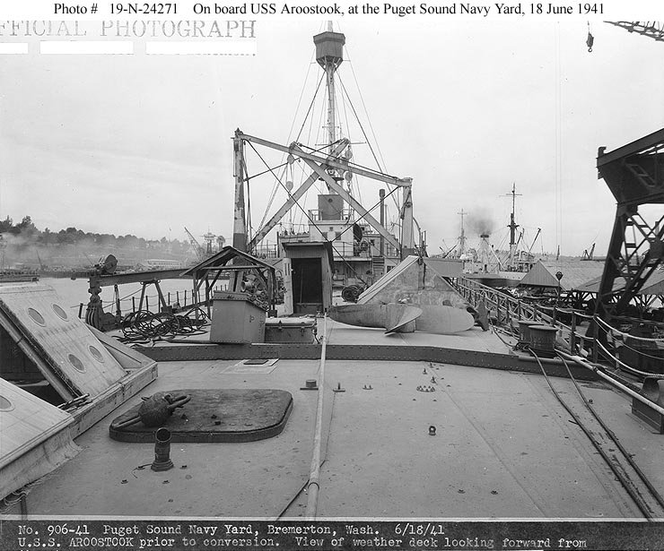 View on board, looking forward from the stern, 18 June 1941. Taken at the Puget Sound Navy Yard, Bremerton, Washington. The ship was then in the early stages of an abortive attempt to return her to active Navy service after having been laid up since March 1931. Note the propeller and anchor stowed on her deck | Photo from the Bureau of Ships Collection in the U.S. National Archives National Archives photo 19-N-24271 ![]() 110k |