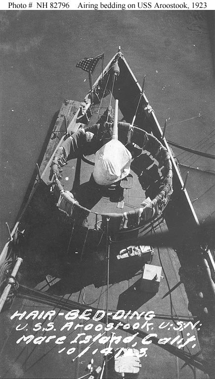 View looking over the bow from the ship's bridge, 14 October 1923. Note bedding airing on the rails around Aroostook's 3"/50 gun | Donation of Mrs. Kelly Green, 1974 Naval History and Heritage Command photo NH 82796 ![]() 89k |