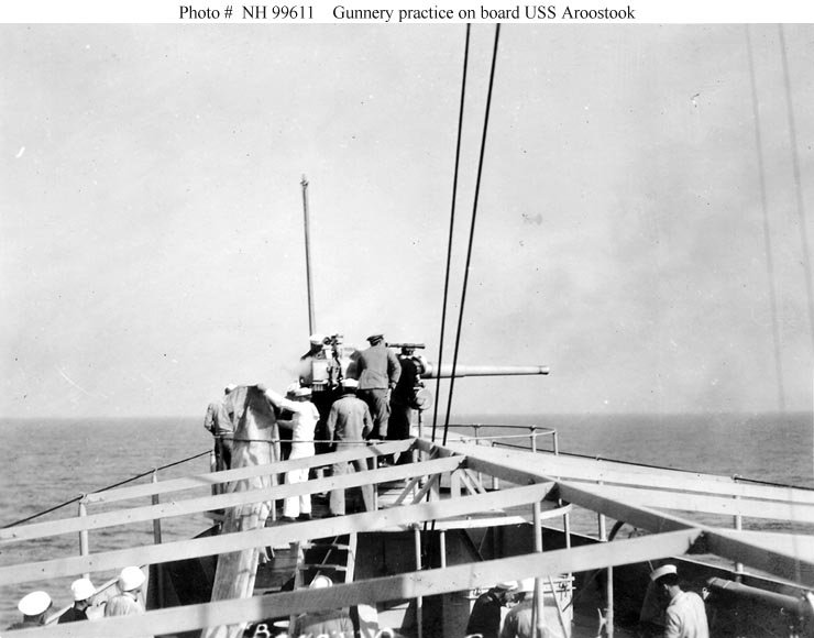 Ship's forward 3"/50 gun firing during gunnery practice, circa the later 1920s. Note men holding canvas to catch ejected shells | Collection of Lieutenant Oscar W. Levy, USN (Supply Corps), Retired Naval History and Heritage Command photo NH 99611 Aroostook (AK 44) |