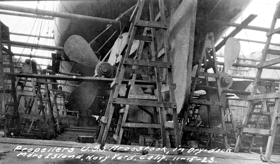 In drydock at the Mare Island Navy Yard, California, 15 November 1923. View of the ship's four-bladed propellers and rudder | Donation of Mrs. Kelly Green, 1974 Naval History and Heritage Command photo NH 82902 Mike Green |