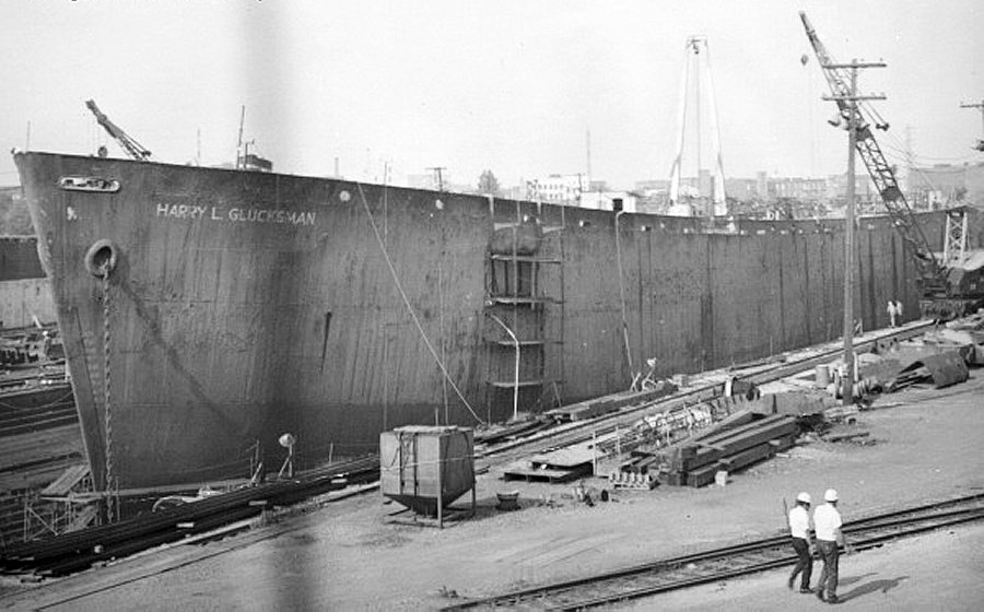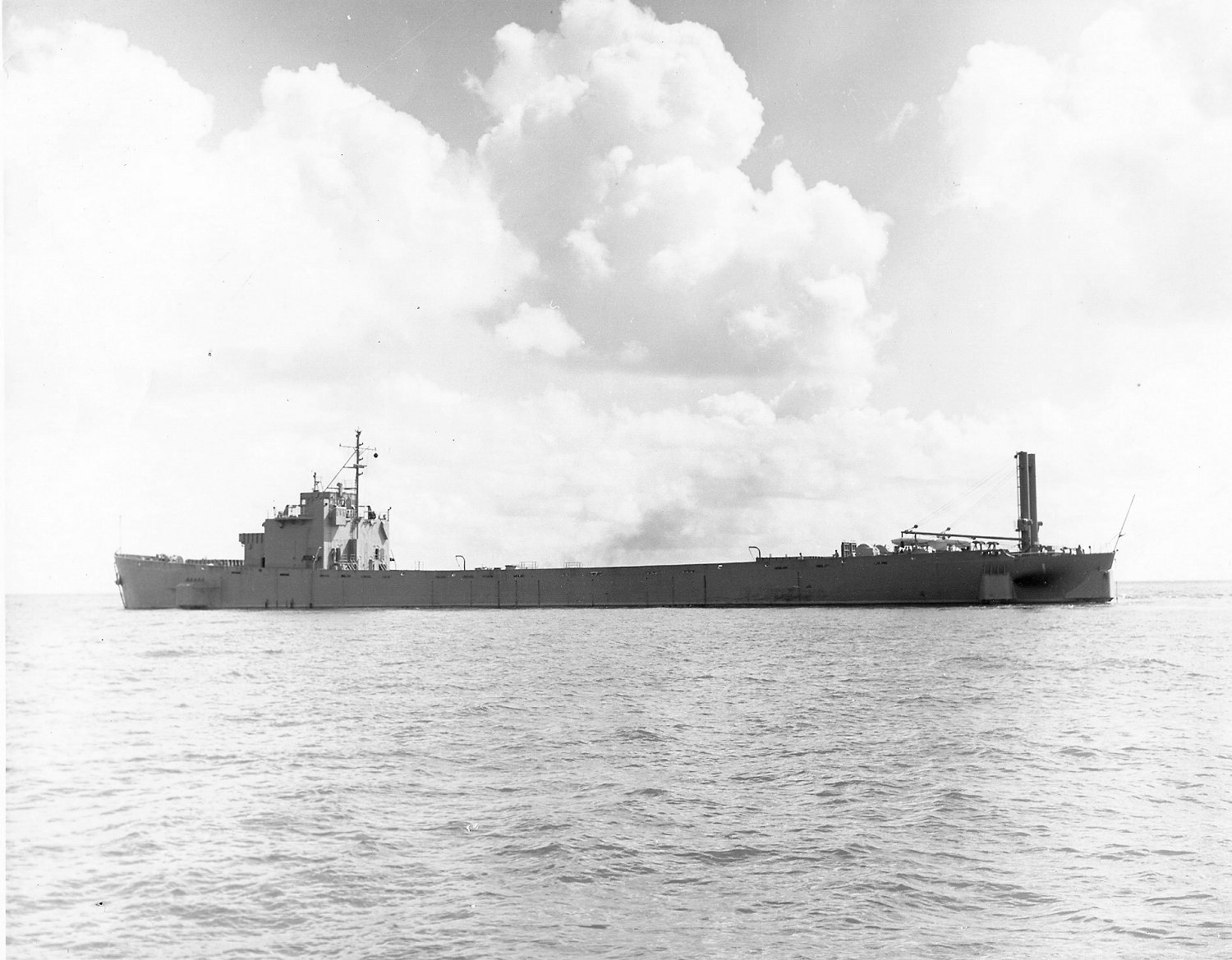 Pierside at American Shipbuilding, Lorraine, Ohio, in April 1969 U.S. Navy photo and article from the April 1971 edition of All Hands magazineMINESWEEPER SPECIAL "THE WORLD'S LARGEST OUTBOARD"A research and development project undertaken in the Atlantic Fleet Mine Force was centered on tests of the Minesweeper Special (MSS-1), a virtually unsinkable ship which literally would have to be blown to bits before it could be sunk. MineLant tested the ship, officially considered a "device," in search of an unsinkable ship capable of sweeping influence mines. Tests to date have been encouraging. Traditionally, minesweepers are built with wooden hulls to present the smallest possible magnetic signature. Steaming through a suspected mined area, the ordinary sweeper trails sound and magnetic equipment which detonates mines at a safe distance behind the ship. The Minesweeper Special takes a different approach. Built on a converted World War II Liberty class hull, the MSS-1 measures some 440 feet long and 57 feet wide and displaces nearly 15,000 tons. She is "unsinkable" because she is filled with about 140,000 cubic feet of styrofoam. All compartments below the waterline are flooded for additional ballast. According to Lieutenant Eugene N. Cate, officer in charge of the ship, this arrangement means that shock waves from nearby explosions "pass through" the steel hull. Naturally, the steel hull of the old Liberty ship presents a large magnetic signature and this is the whole idea. The main deck is also ringed with huge magnetic coils to enhance the ship's magnetic field, and there is equipment on board which produces noise in all frequencies. "The theory is to take our unsinkable ship into mined areas and purposely use it to detonate influence mines by presenting the maximum ship signature," LT Cate said. During shock tests in the Gulf of Mexico, LT Cate and the eight MSS-1 crewmembers took several teeth rattling explosions in the relative safety of the craft's shock-mounted pilothouse. "In all tests we were strapped into padded chairs in the pilothouse," the o-in-c explained, "and with four horizontal and four vertical piston-type shock absorbers we were able to take the blasts quite well." Since the original crew brought the ship to Charleston in August 1969, the MSS-1 has (as of October 1970) undergone eight severe shock tests with the crew on board. No one was injured, but the old Liberty ship was beginning to show minor evidence of the explosions which dump tons of water on her in a matter of seconds. The Minesweeper Special is powered by five inboard-outboard drive diesel engines mounted above the waterline to minimize the risk of damage or loss of propulsion and steering. As might be expected, the crew refers to the ship as "the world's largest outboard." ~ John J. Gravat An MUC for MSS-1The Meritorious Unit Commendation was awarded last October to the officer in charge and other members of the original crew of the Minesweeper Special MSS-1. Receiving the award were Lieutenant Eugene N. Cate; BM1 Charles B. Whitworth; RD2 Kenneth W. Hoppe and SN Bailey T. Groome, III. In addition, LT Cate was awarded the Meritorious Service Medal and BM1 Whitworth received the Navy Achievement Medal in recognition of individual efforts on board the experimental craft. A citation signed by the Chief of Naval Operations stated in part: "Without benefit of formal training or previous experience with the type of command control facilities installed in Minesweeper Special, the officer in charge and crewmembers assigned undertook the task of developing the unit from an unknown and untried entity to an operationally tested and capable mine countermeasures platform." |