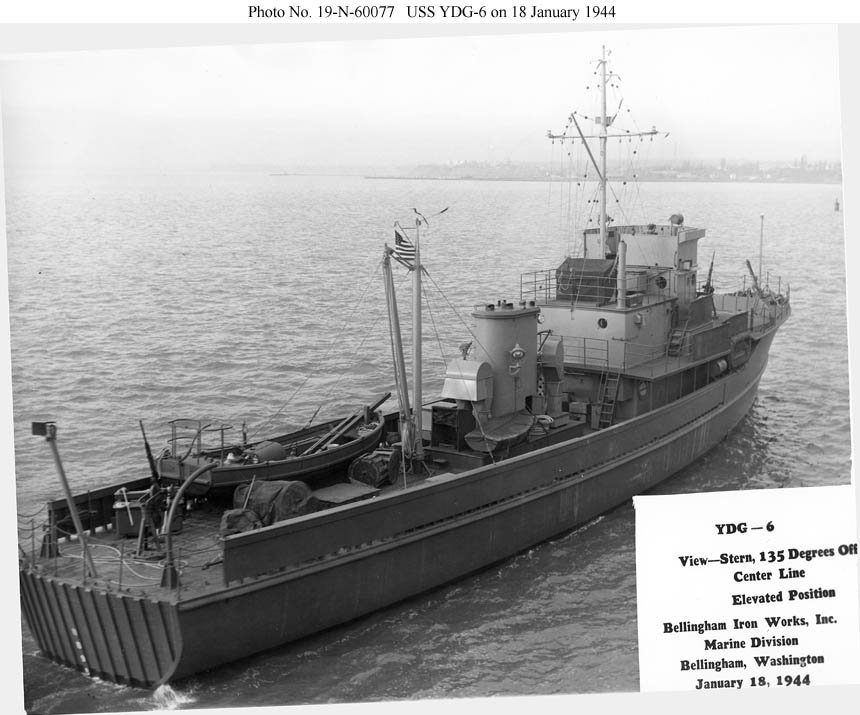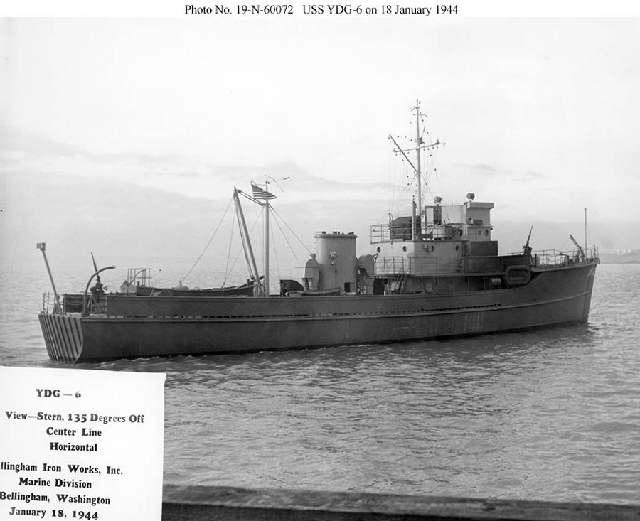 91k | YDG-6 photographed by her builder on 18 January 1944 National Archives photo 19-N-60070 from the Naval Historical Center at Shipscribe.com |