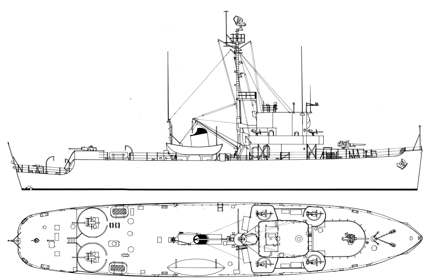 Line drawing of starboard side and overhead view of Van Kiep II. She is armed with one 3"/50 gun, one 81mm mortar right aft, two single 40mm guns, and four single 20mm guns. No sonar or ASW weapons are carried. The radar is an SPS-5. She has berths for forty-five passengers at the after end of the extended forecastle, portside Line drawing by A. D. Baker III from U.S. Small Combatants: An Illustrated Design History by Norman Friedman |